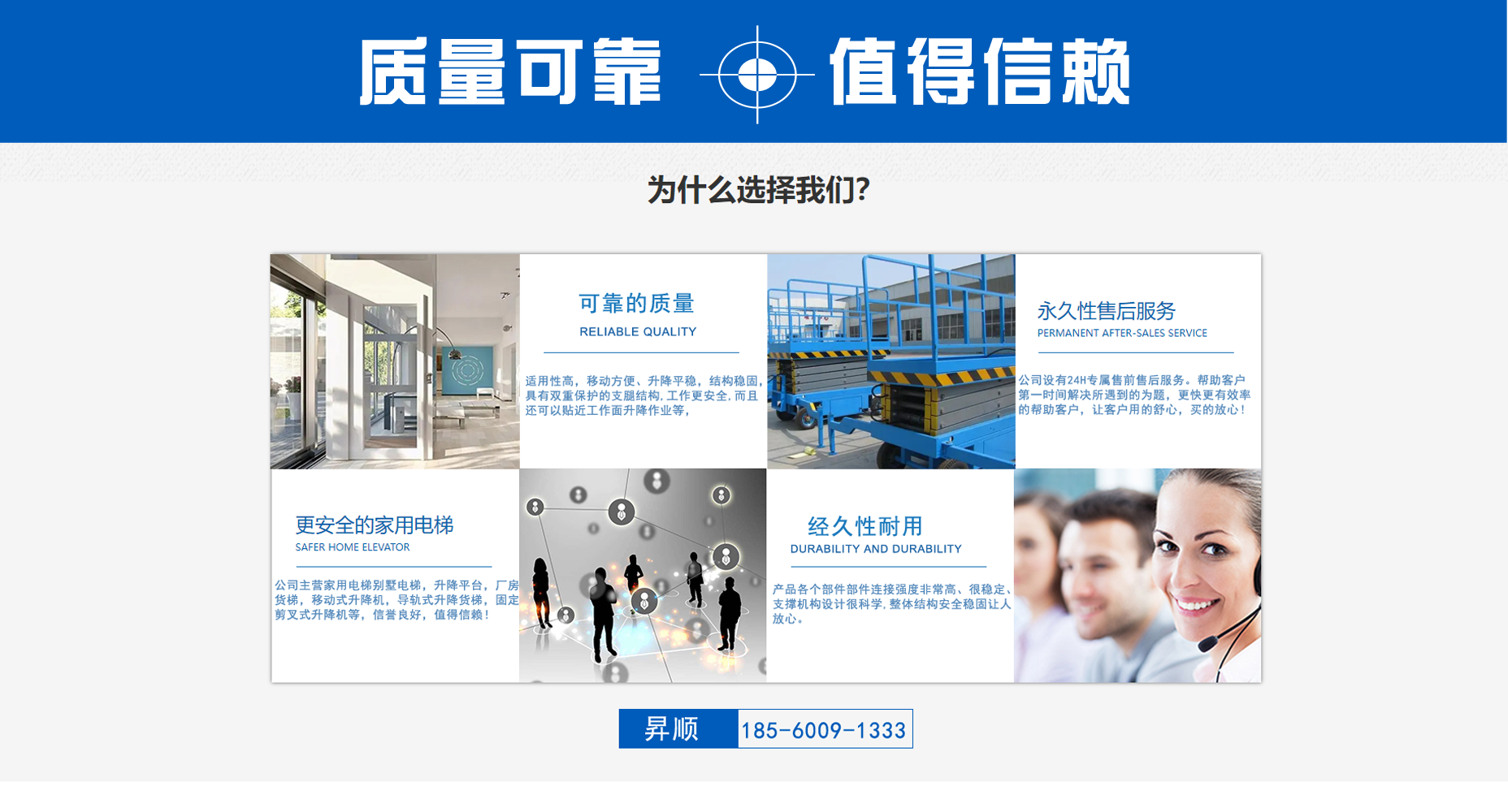 山東昇順液壓升降機械有限公司是一家主營家用電梯,別墅電梯,升降平臺,廠房貨梯,移動式升降機,導軌式升降貨梯,固定剪叉式升降機等產品企業,質量可靠,值得信賴。  用戶至上,以用戶為中心”是公司永遠堅持的服務宗旨,贏得用戶的贊許是我們的榮譽,及時滿足用戶的需求,是我們公司的愿望。長期以來,公司員工以優質的服務,取悅于用戶,以誠信的言行取信于用戶,得到了用戶們的好評。我們期待著與您更加愉快的合作!公司的發展,離不開社會的大力支持,在社會的支持和幫助下,我們正昂首闊步邁向未來!  我們的經營方針是:以質量求生存,以產品求發展,以信譽保合作,以服務贏客戶?! ”竟緦Ξa品質量和各項服務恪守合同承諾,并愿與新老客戶精誠合作,共創未來?! 」揪瘢簞撔率侵黝},超越是不懈的追求?! 」咀谥迹盒抛u保證,誠信為本?! ∥覀儠院侠淼膬r格,良好的信譽,雄厚的實力,優質的產品,最周到的服務,服務于廣大新老客戶!...
